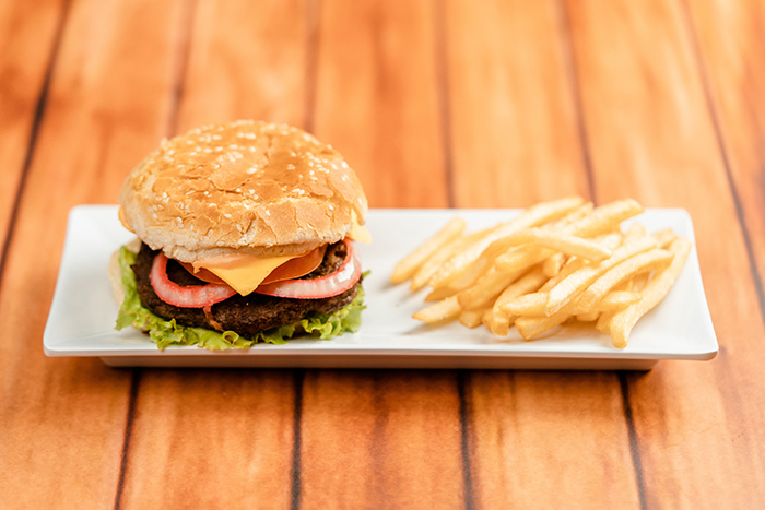 Hamburguesa 100% carne de res + 1 orden de papas fritas + 1 refresco de 20oz.
