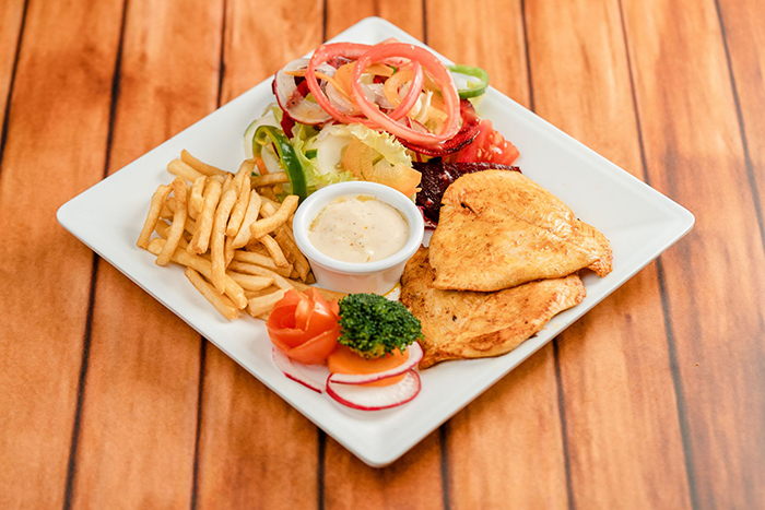 100% Filete de pechuga preparado a la plancha. Acompañado de papa al vapor con salsa de queso o tostones, ensalada, arroz. Con tu salsa preferida: Salsa Mozzarella, Salsa Jalapeña o